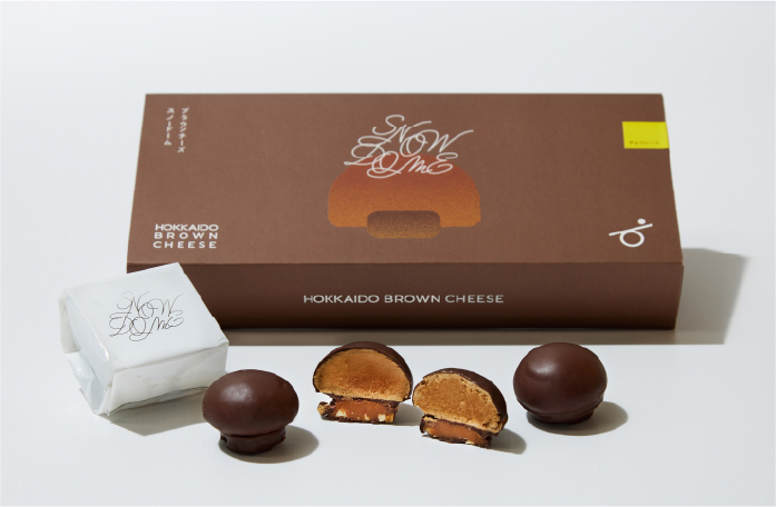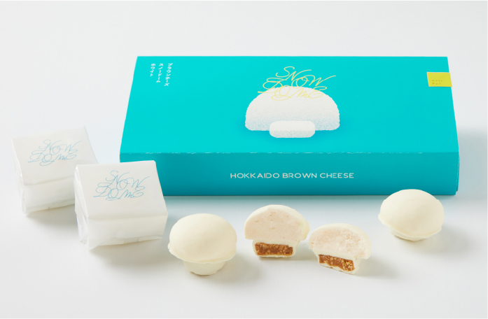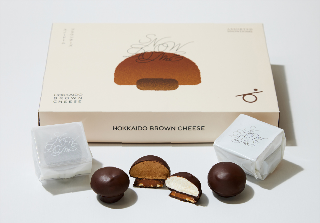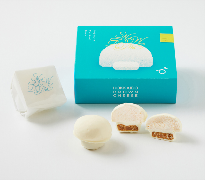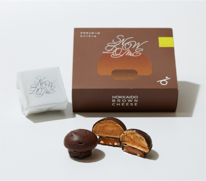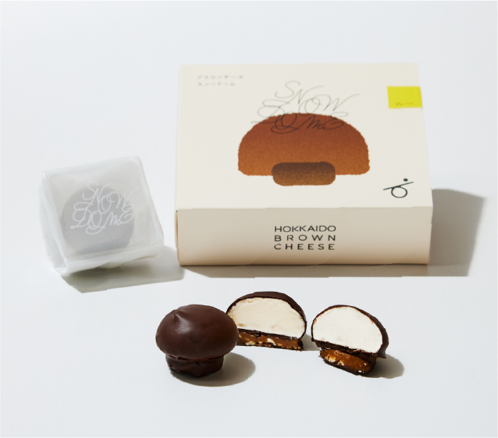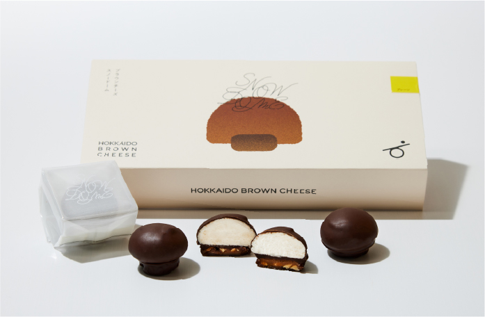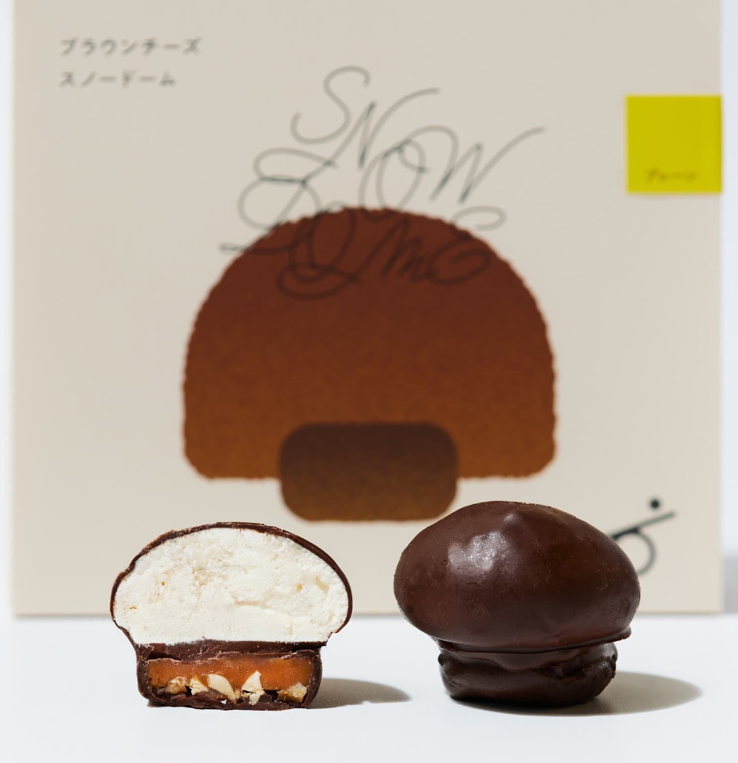 とろけるリッチなブラウンチーズと、ふわっと軽やかなメレンゲ、その周りを包みこむなめらかなチョコレート。異なる素材が折り重なって、口に入れた瞬間にそれぞれの「とろける」がひとつに。ころんとまぁるい手のひらにのるスノードームのような愛らしいフォルムです。