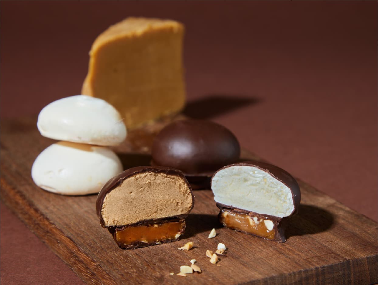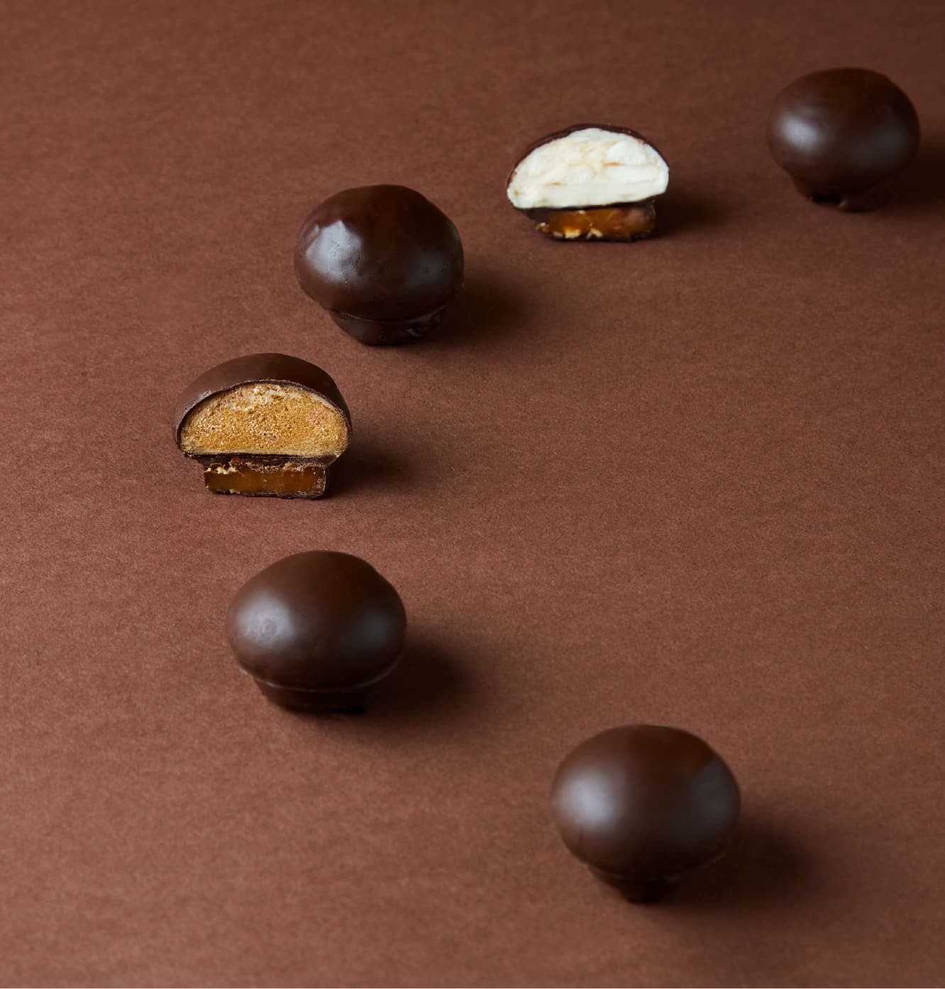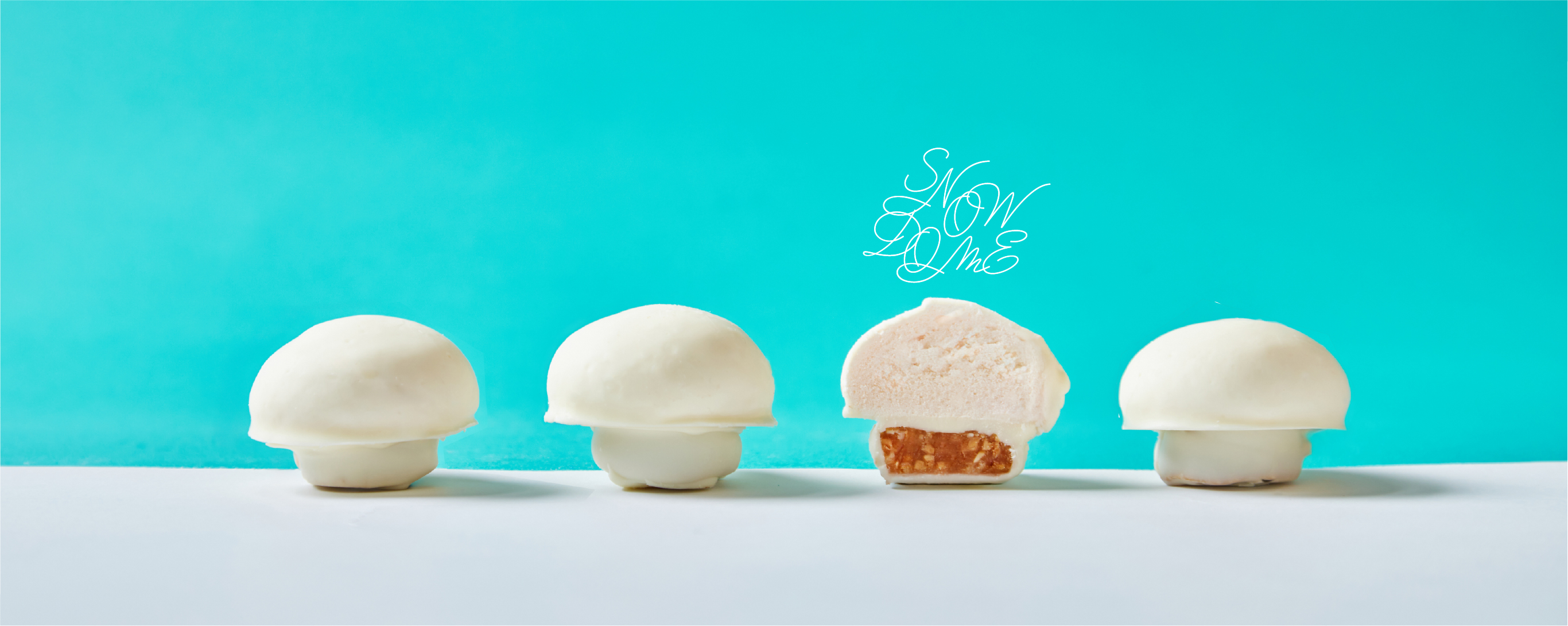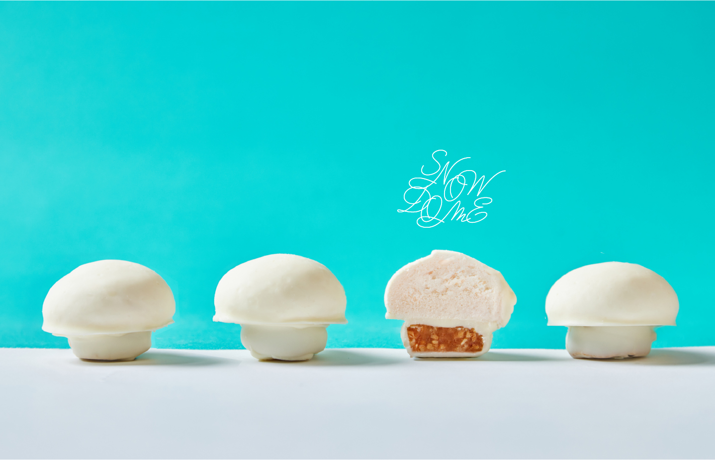 とろけるリッチなブラウンチーズと、ふわっと軽やかなメレンゲ、その周りを包みこむなめらかなチョコレート。異なる素材が折り重なって、口に入れた瞬間にそれぞれの「とろける」がひとつに。ころんとまぁるい手のひらにのるスノードームのような愛らしいフォルムです。